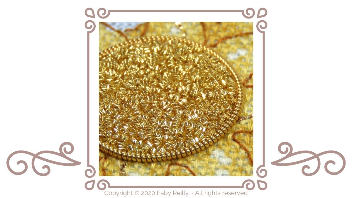 Goldwork: learn how to use Bright Check Purl to fill a chip work area.